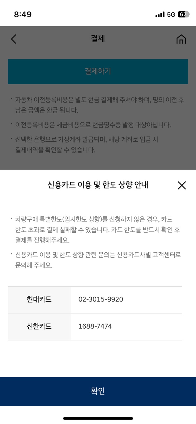 이전등록비 및 잔금 결제(현대카드 포인트적립 차량가액의 1.5%)